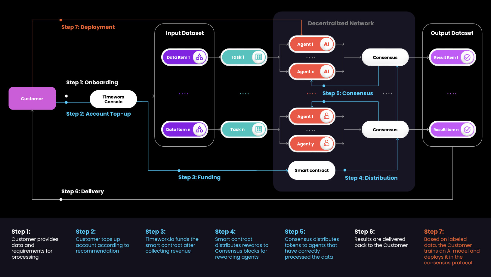 The platform’s approach is trustless: no agent is considered trusted, whether human or AI. All data processing outcomes need to be deemed correct only through consensus achieved using the decentralized data processing protocol. Timeworx.io employs robust quality control mechanisms as on-chain proofs of performance for all data processing agents. Constant performance validation, regular audits and feedback loops ensure that the processed data is of the highest quality.
